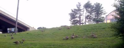 Auf einem dieser Greenways gehe ich auch regelmäßig Laufen, wobei mir regelmäßig allerlei Getier begegnet. Zum Beispiel eine Horde Gänse mit Jungvögeln.